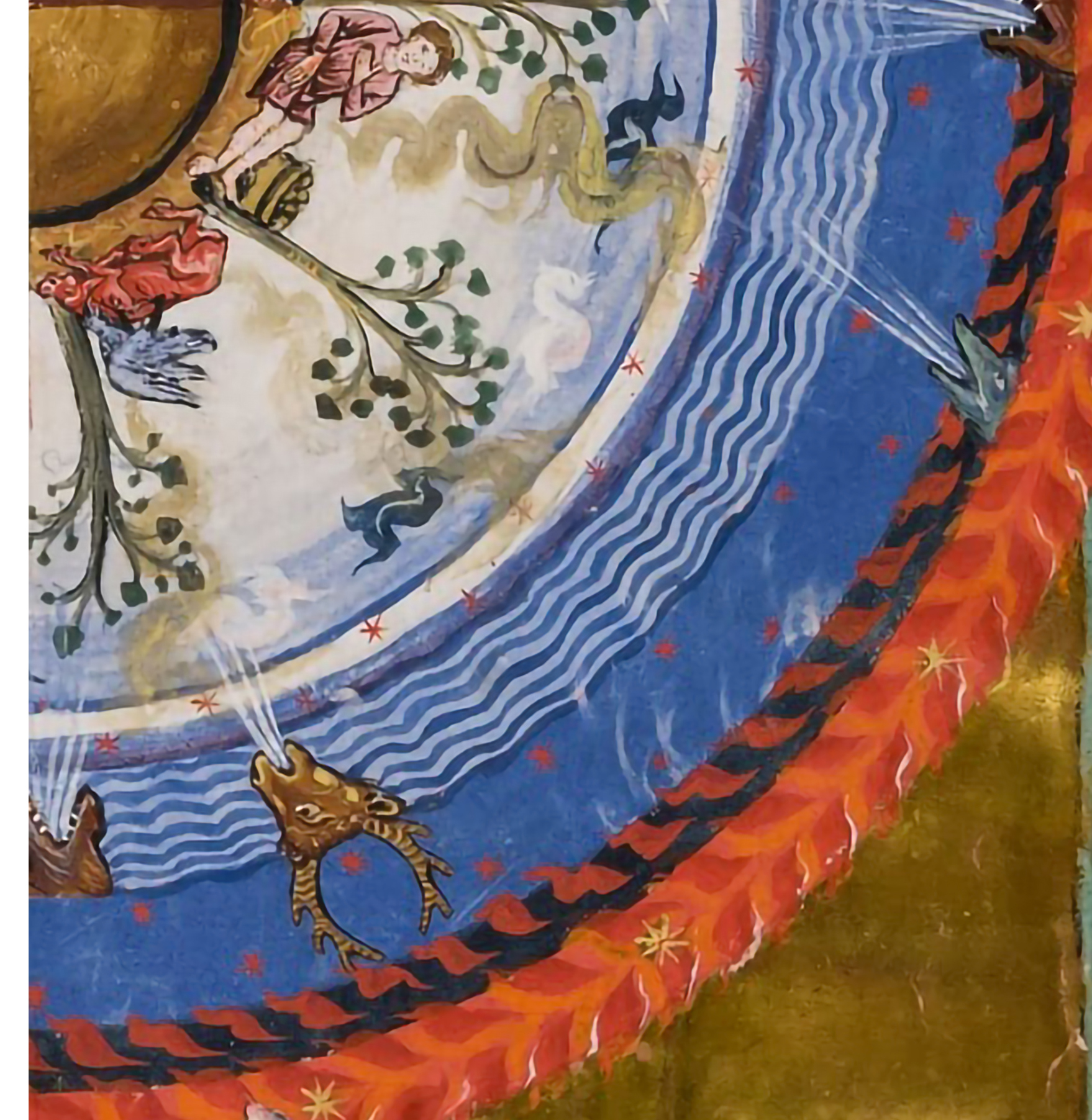 In Cause et Cure, Hildegard identifies the causes of a great many disorders. All diseases share a common origin: original sin, which introduced corruption into the human body. The forbidden fruit poisoned Adam’s body, rendering his flesh ulcerated and pierced. These ulcers and perforations generate turbulence and moisture of vapor within humans, from which phlegm arises and coagulates, bringing various illnesses upon the human body.[8] In addition to this common cause—both spiritual and physical—Hildegard also attributes diseases to more specific factors. Many pathologies arise from an imbalance among humidum, siccum, tepidum, and spuma/spumaticum within the organism.